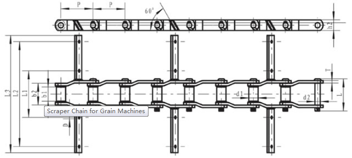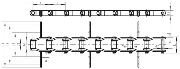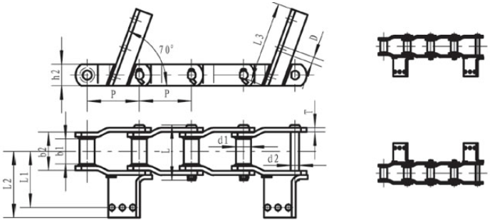 Chain No.Pitch P (mm)Outer diameter of bushing d1 (mm)Diameter of pin d2 (max) (mm)Height of sidebar h2 (max) (mm)Inner width between small ends b1 (mm)Outer width between small ends b2 (mm)Thickness of sidebar T (mm)Dimension of scraperTensile strength Q (min) (KN)