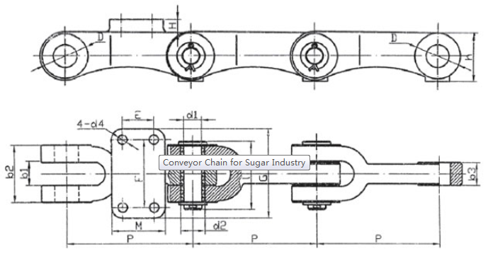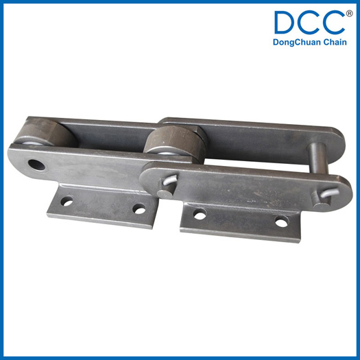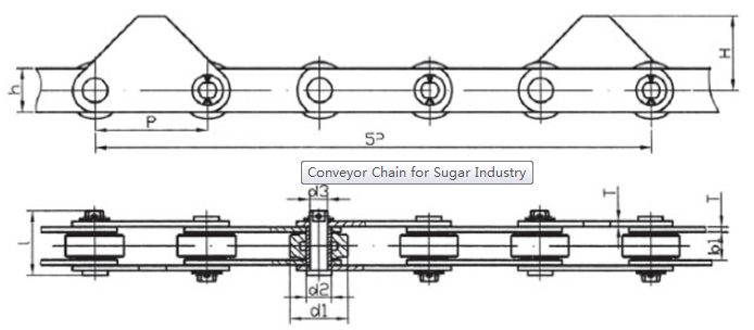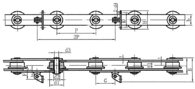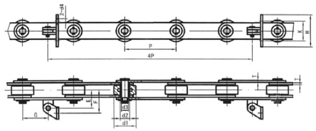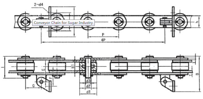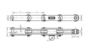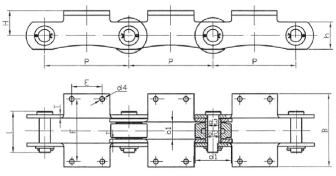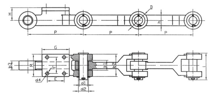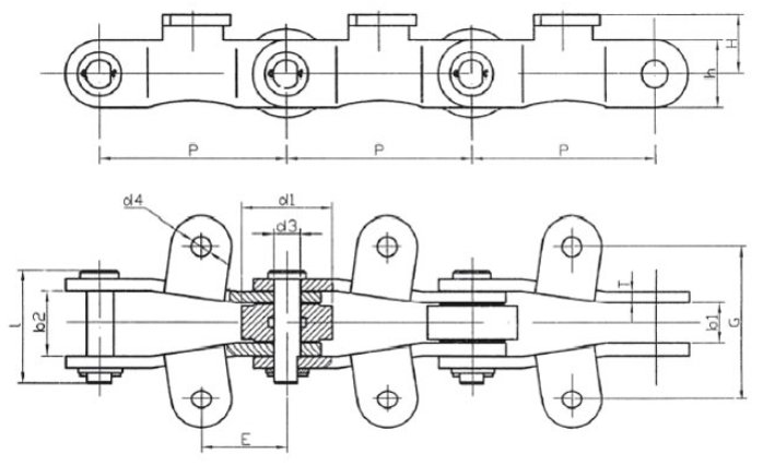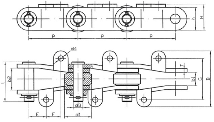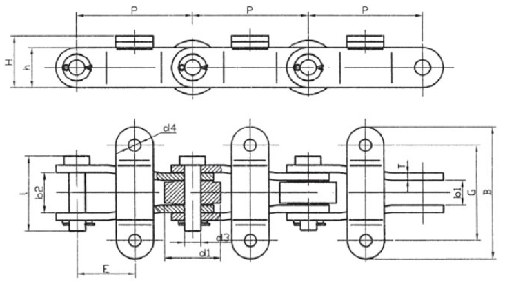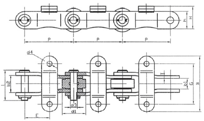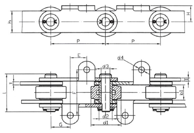 Chain no.Pitch P (mm)Inner width of inner link b1 (min.) (mm)Diameter of pin d3 (mm)Diameter of roller d1 (min.) (mm)Height of sidebar h (mm)Thickness of sidebar T (mm)Length of pin L (mm)Central distance of attached plate f(mm)Hole distance of attached plate L1(mm)Hole diameter of attached plate d4(mm)Spanning width of attached plate L2(mm)Height of attached plate h4(mm)Tensile strength (KN)
